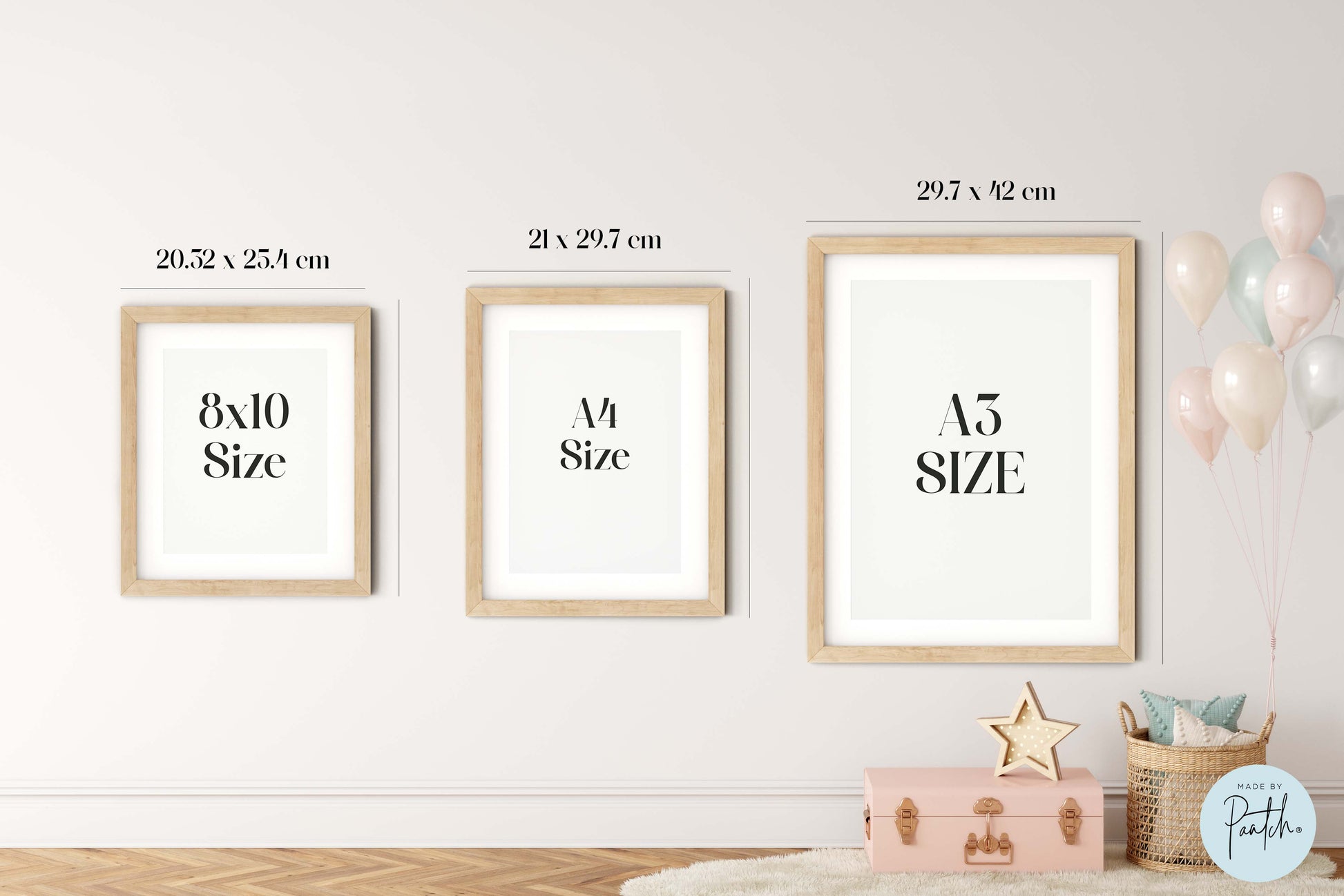 A4 - 210 x 297 mm (8.3" x 11.7") print in an overall frame size of 40.64 x 30.48 cm with a 1.3mm thick textured vanilla core mount board.
